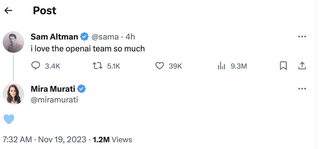 Ik vermoed dat Altman nog wel even wacht tot het bestuur is opgezouten, want hij heeft heus geen zin om weer helemaal opnieuw te beginnen en de voorsprong die OpenAI momenteel heeft, op te geven. Vooral omdat er miljarden in kas zitten en er geen zeggenschap van de investeerders is. Intussen is Mira Murati alweer hartjes aan het plaatsen onder de tweets van de man die ze vrijdag nog opvolgde.
