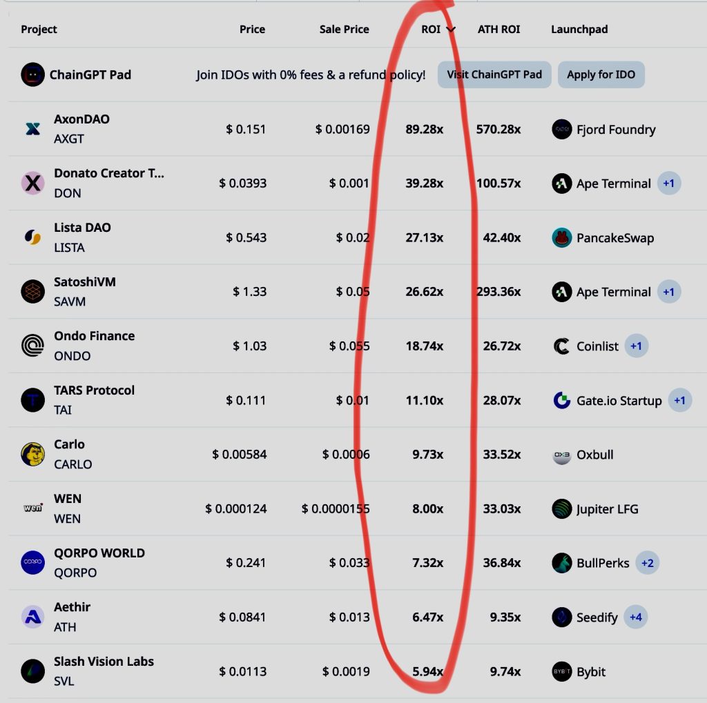 In bovenstaand plaatje is het zaak om niet te focusen op de ATH, de All Time High. Er gaat immers geen belletje op het hoogste punt en de kans om precies op dat moment te verkopen, is bijzonder gering. Maar op een site als Cryptorank is goed te zien wat de resultaten zijn van bijvoorbeeld nog dit jaar aangekochte muntjes.