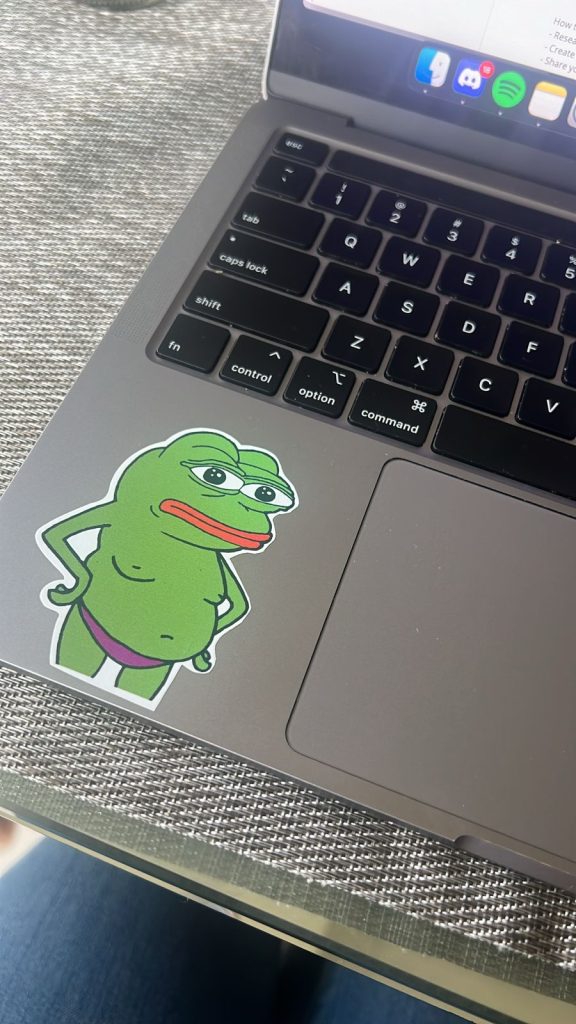 Wie vertrouwt een arts met deze lollige sticker op haar laptop? Maar de market cap van $5 miljard van Pepe en de stijging van bijna 700% in het laatste jaar, zijn serieus.