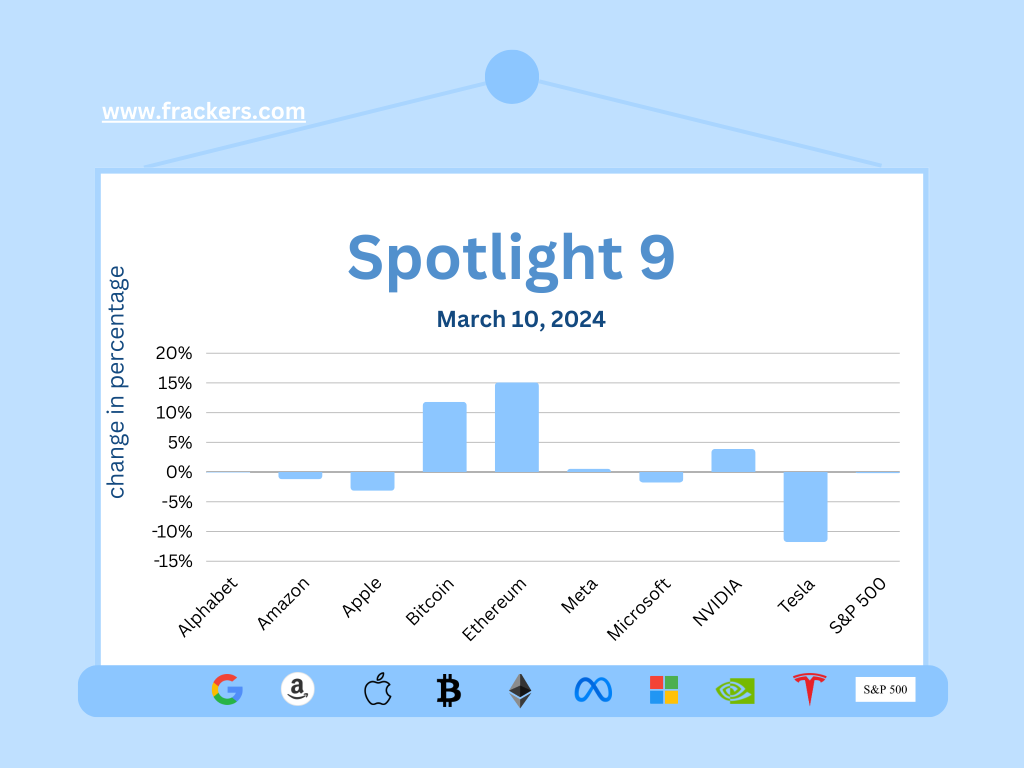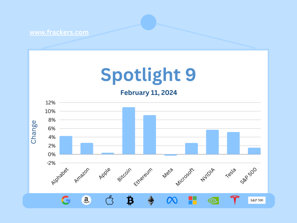 Mijn Spotlight 9, bestaand uit de grootste techaandelen en twee leidende cryptos, Bitcoin en Ethereum: gemiddeld +71% in het laatste jaar