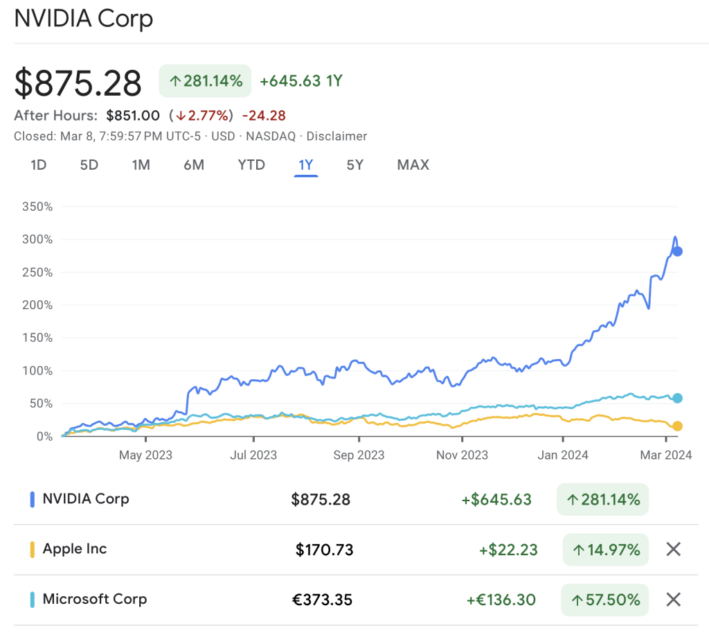 De koersontwikkeling van Nvidia, Apple en Microsoft in de laatste 365 dagen.